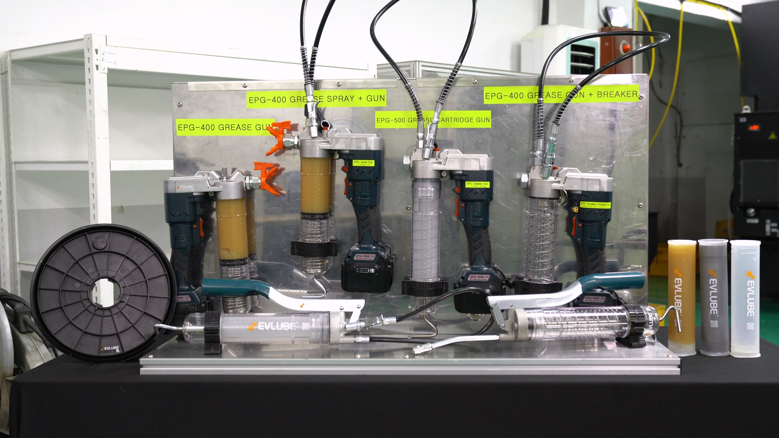 전동형 모델인 EPG 투명 전동 그리스 건 역시 동일한 투명 컨테이너 구조를 채택해 잔량 확인이 용이하다. 또한 현장 장비 전원을 직접 사용하거나 배터리를 충진해 사용할 수도 있고, 더나아가 타사 배터리 팩을 그대로 사용할 수 있는 아탑터도 공급하고 있다.