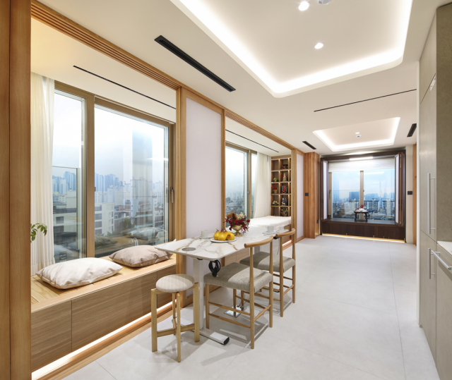 홈플릭스 Living OS가 적용된 주거 공간 내부. 한옥의 여백과 자연 소재에서 영감을 받은 원목 인테리어 안에, 환경 인지·제어 기술이 보이지 않게 내장된 것이 특징이다. / 사진. 홈플릭스