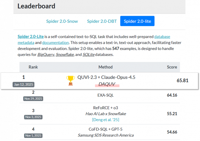 이어 “다큐브의 Text-to-SQL 솔루션 ‘QUVI’는 특정 데이터베이스에 종속되지 않고 다양한 환경에 즉시 적용 가능하다는 점에서 강점을 가지고 있다”며 “남은 Snow 트랙까지 도전해 Spider 전 부문 1위 기록을 목표로 하겠다”고 밝혔다.