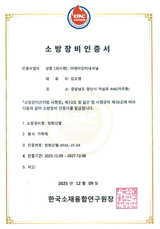 (주)제이인터내셔날은 국내 공공기관을 대상으로 KFAC 인증을 획득한 가죽제 방화신발을 공급하며, 기존 고무제 중심 시장에서 경량성과 착용 편의성을 강조한 대안을 제시하고 있다. 향후 동사는 국내 방화신발 시장의 전환을 이끌며 안전성과 현장 활용성을 동시에 강화해 나간다는 계획이다.